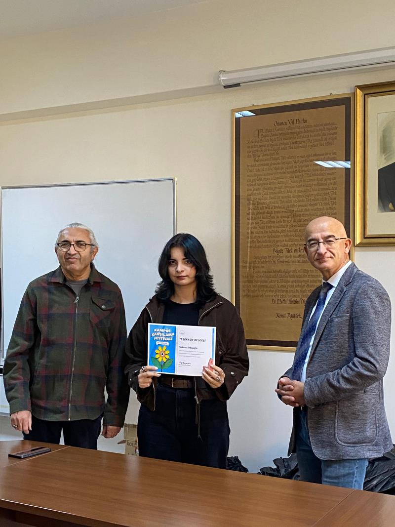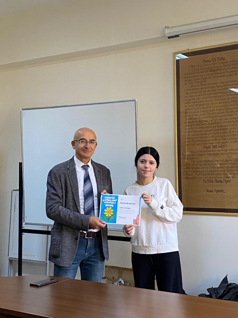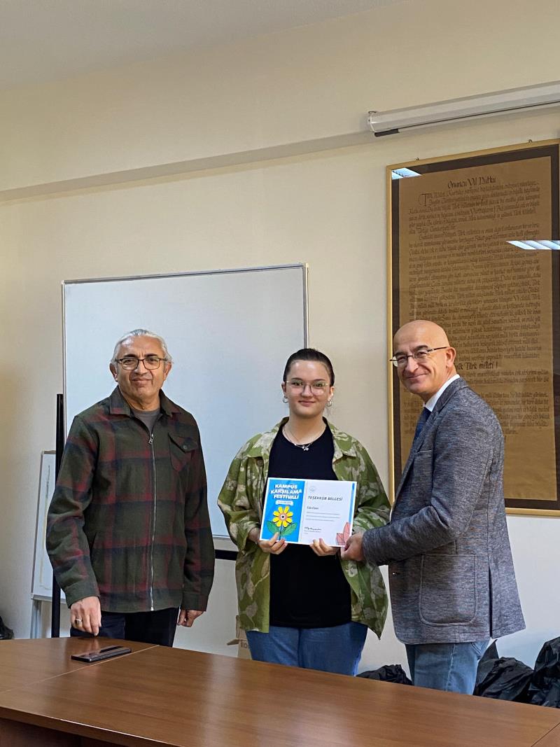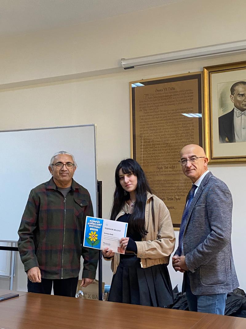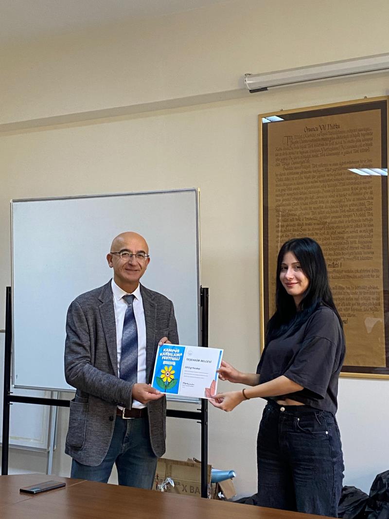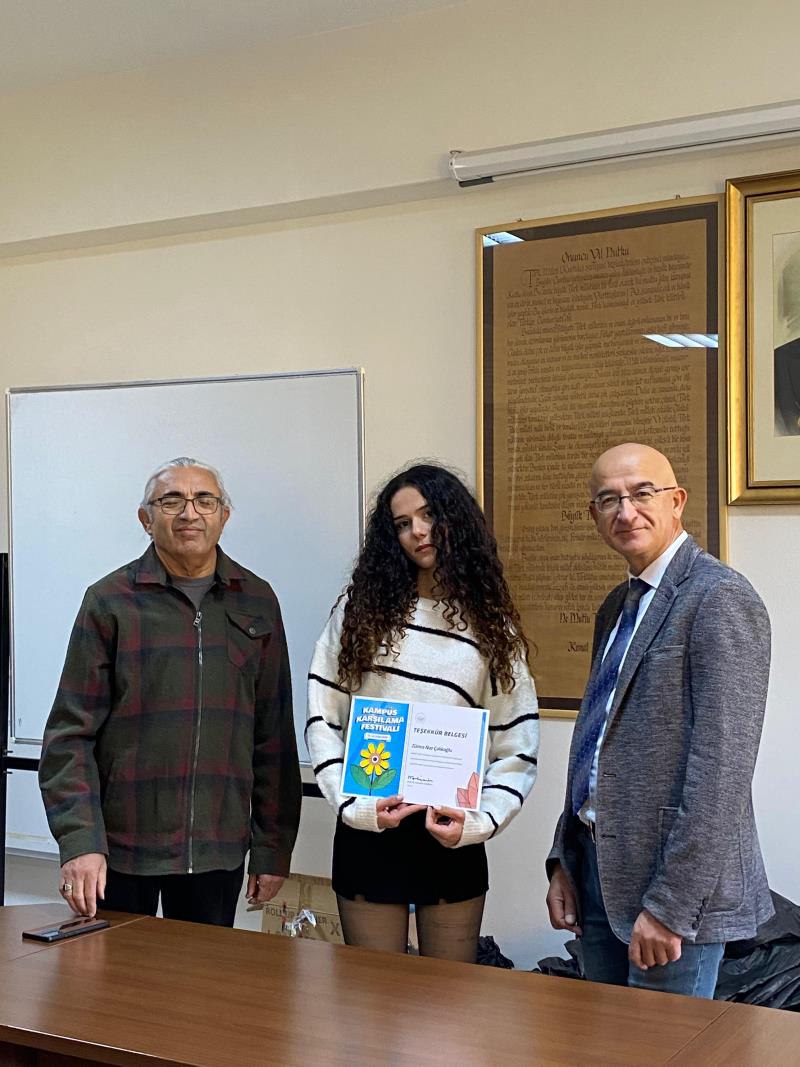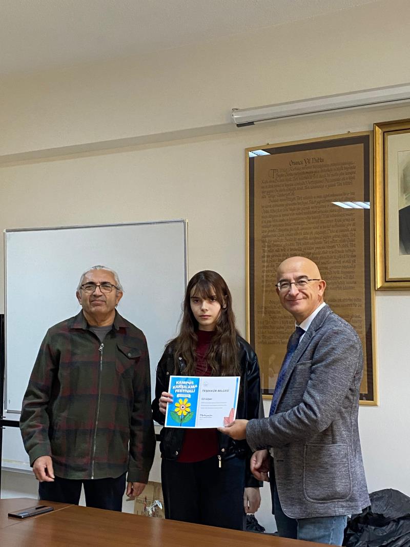 27 Ekim 2025 tarihinde, Eğitim Fakültesi Dekanı Prof. Dr. Üzeyir OK ve Güzel Sanatlar Eğitimi Bölüm Başkanı Prof. Dr. Sadık YÖNDEM tarafından, Eğitim Fakültesi Dekanlık Toplantı Salonunda Karşılama Festivaline katkı sağlayan Öğr. Gör. İlknur KARAGEYİK’e ve öğrencilerine teşekkür belgeleri takdim edildi